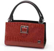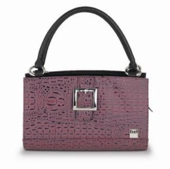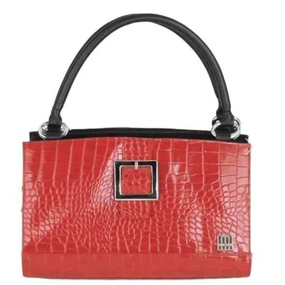 Being a vintage fashionista is easy with the Ellie, now only available in Red. She its simply classic and fun, showing that you are in the know of all things fashion. The shell is made of faux leather reptile print shell includes large silver buckle detail on front will make the envy in any crowd! Silver hardware.