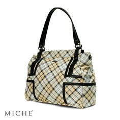 Robin shell for Miche Prima bag. Features light yellow, black and white plaid pattern, black trim accents. Silver hardware and end pockets.